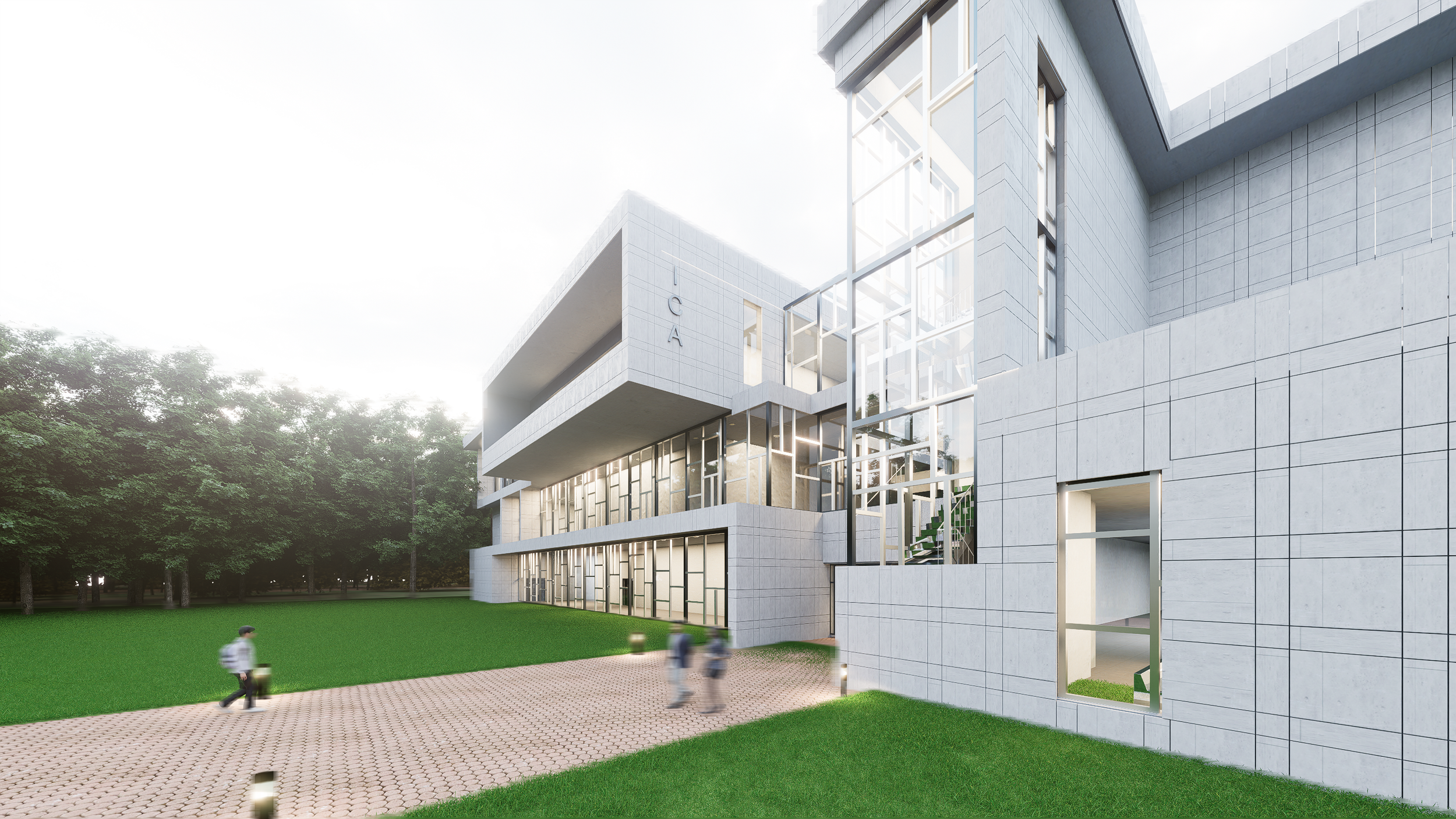 The ICA is designed as a three-story cultural building organized around a central atrium that connects the lobby and shared circulation spaces. Each floor contains a large central program with continuous circulation wrapping around it, reinforcing clarity of movement and spatial hierarchy. The overall form was developed through studies of program adjacencies and circulation, using simple volumes that were pushed and pulled to create a dynamic massing condition. Interior gallery spaces employ offset grid systems to guide partitions, skylight placement, and spatial sequencing while supporting controlled lighting conditions for exhibitions.